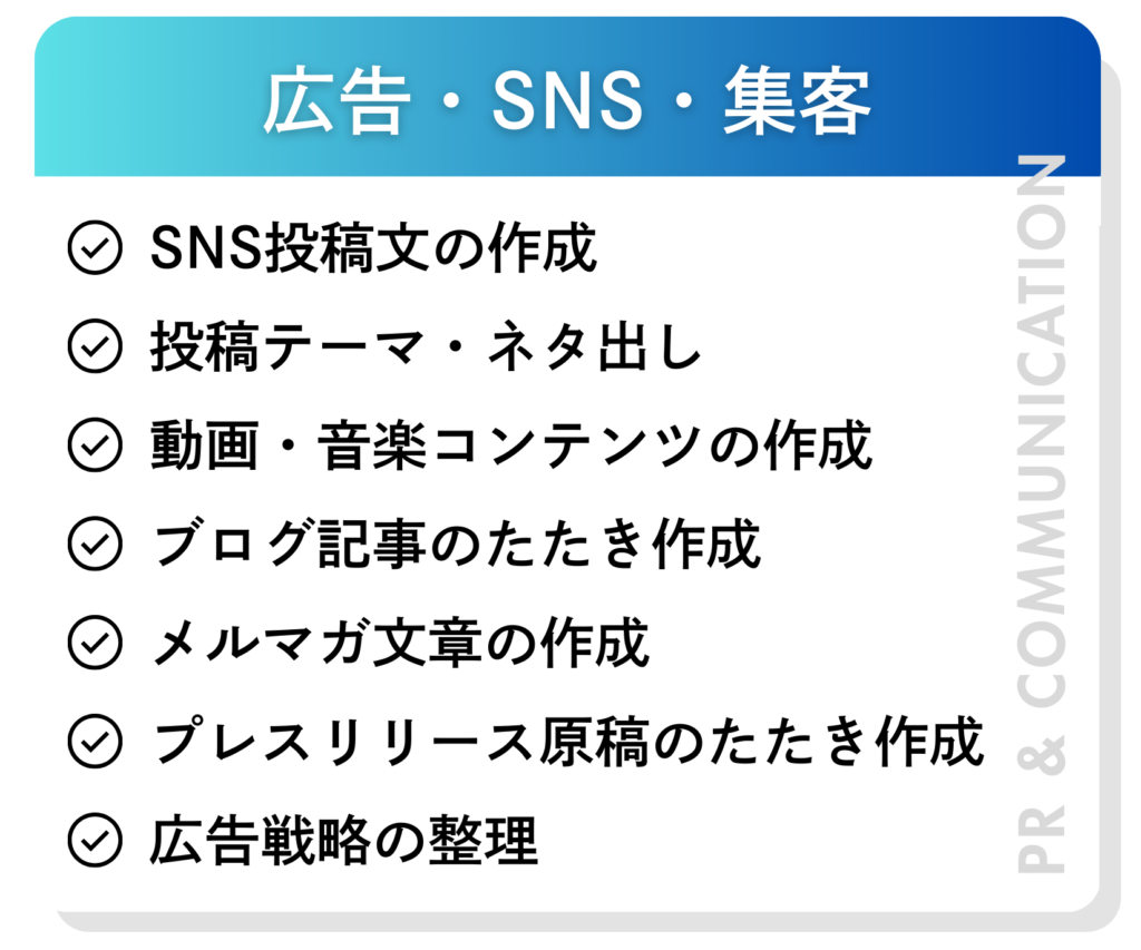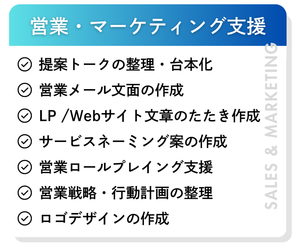 AIM8では、経営戦略の整理や業務改革といった経営テーマから、営業資料や企画書の作成、営業ツールのリブランディング、マーケティング・SNS運用、採用広報、バックオフィス業務の効率化まで幅広い業務に対応しています。