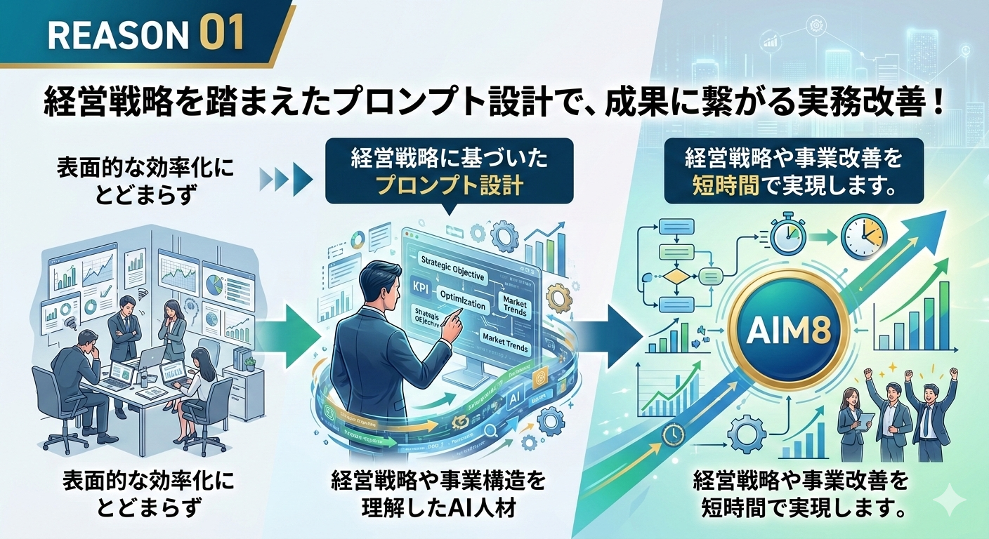業務内容にもよりますが、多くの企業様が導入から1ヶ月以内に「作業時間の削減」や「アウトプットスピードの向上」といった変化を実感されています。AIM8では、単にAIで作業を効率化するのではなく、経営や業務改善の視点で設計された独自の「経営プロンプト」を活用して業務を進めています。