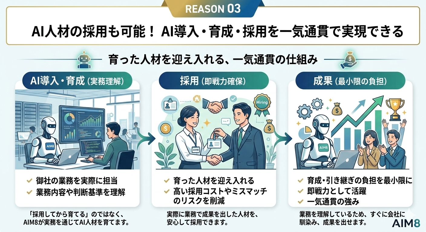 その場合、AIM8のメソッドを理解した人材をそのまま社内に迎えることができるため、AI活用やDXの内製化を大きく進めることができます。