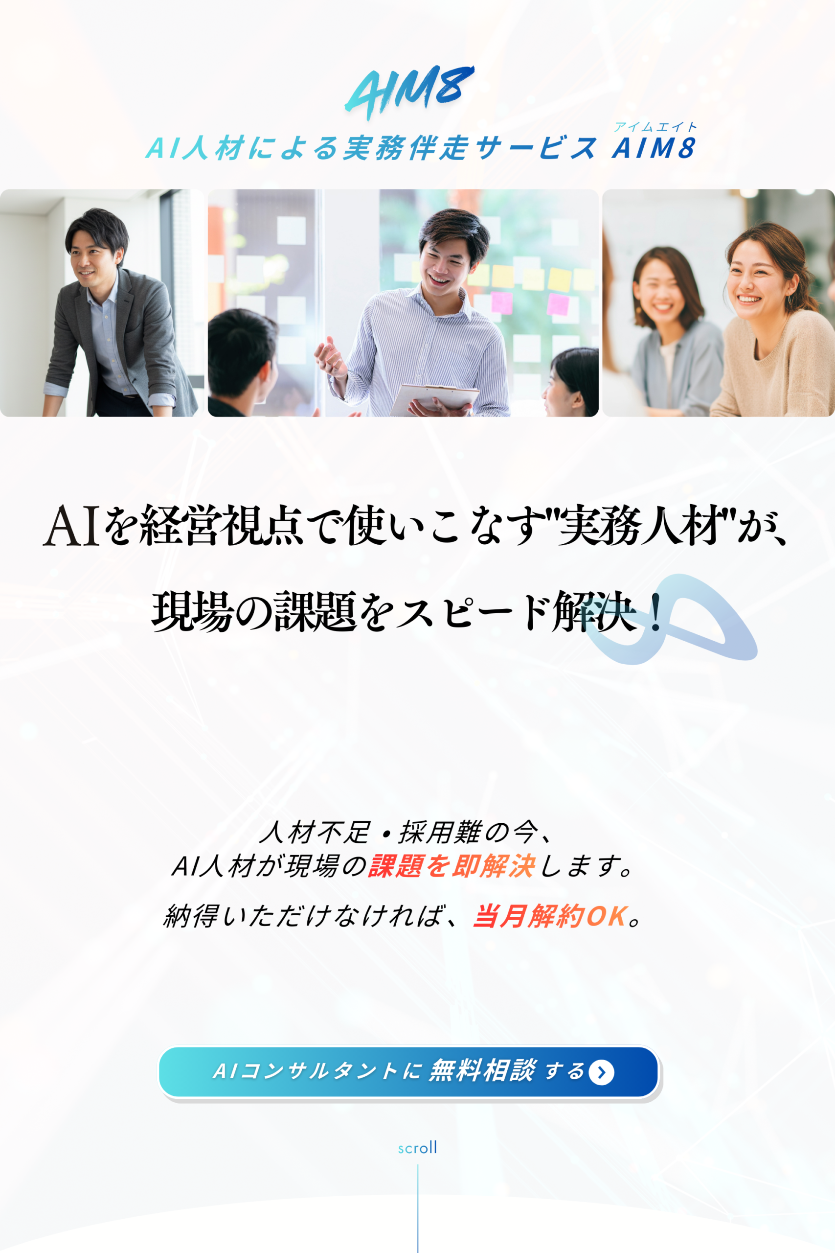 AIM8の最低利用期間は1ヶ月です。まずは1ヶ月ご利用いただき、実際の業務の中でAIを活用した業務改善やアウトプットの変化を体験していただくことをおすすめしています。